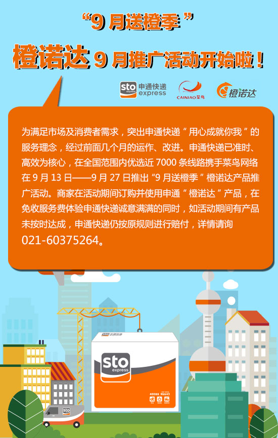 經(jīng)多日組織、籌備,九月十三日起申通快遞為迎合市場需求,進一步拓展市場空間,搶占優(yōu)質(zhì)市場份額,發(fā)起了“九月送橙季”橙諾達產(chǎn)品推廣活動。